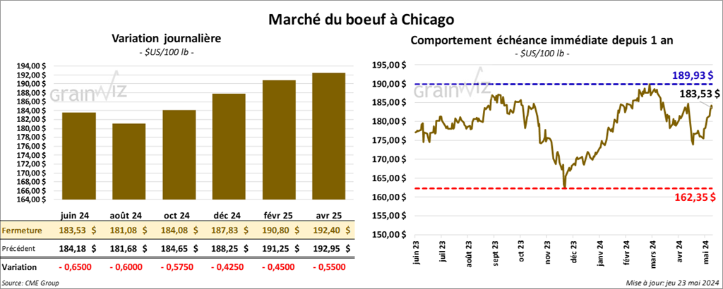 Le contrat de bœuf US juin 24 a clôturé à 183,53 $ (- 65 cents). Celui août 24 a fermé à 181,08 $ (- 60 cents). Celui oct. 24 a terminé à 184,08 $ (- 58 cents). Quant au veau US, le contrat août 24 a fini à 261,45 $ (- 1,45 $). Celui sept. 24 a clôturé à 262,73 $ (- 1,03 $). Celui oct. 24 a fermé à 263,73 $ (- 88 cents).