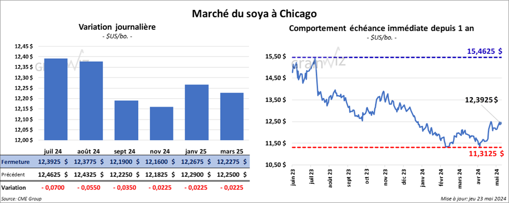 Le contrat de soya US juil. 24 a clôturé à 12,3925 $ (- 7 cents). Celui août 24 a fermé à 12,3775 $ (- 5 ½ cents). Celui sept. 23 a terminé à 12,1900 $ (- 3 ½ cents). Quant au tourteau de soya US, le contrat juil. 24 a fini à 376,70 $/tonne (- 1,50 $/tonne). Celui août 24 a clôturé à 372,90 $/tonne (- 90 cents/tonne). Celui sept. 24 a fermé à 371,10 $/tonne (- 10 cents/tonne). Du côté de l’huile de soya US, le contrat juil. 24 a terminé à 45,19 $ (- 69 points). Celui août 24 a fini à 45,48 $ (- 66 points).
