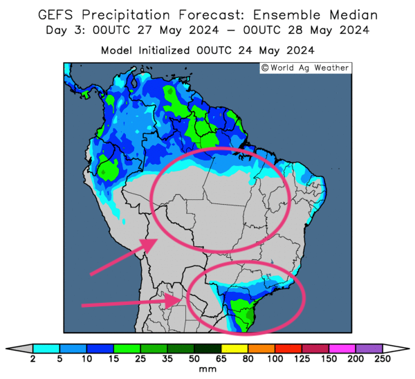 Essentiellement, les conditions de culture au Brésil demeurent difficiles à court terme. Les conditions dans l’extrême sud, c’est-à-dire au Rio Grande do Sul, pourraient s’améliorer lentement pour permettre aux sols de s’assécher graduellement. Ailleurs, dans le centre et le sud-ouest du Brésil, le temps est toujours plus sec.