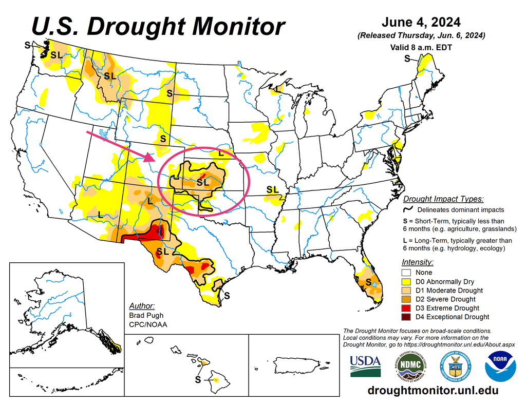 Cette carte US, fournie par l’US Drought Monitor et dessinée pour le 4 juin dernier, ne montre quasiment pas de signes de sécheresse, sauf pour certaines parties du Kansas et de l’Oklahoma (voir la zone encerclée).