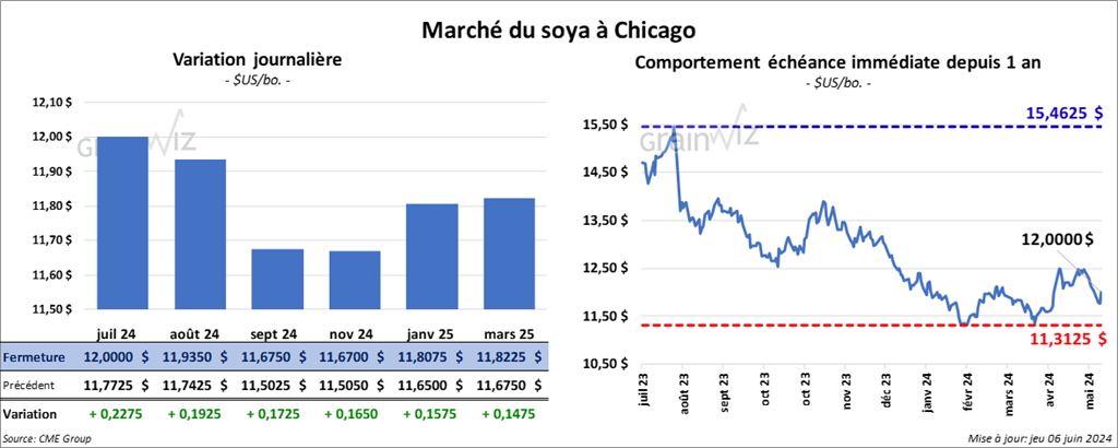 Le contrat de soya US juil. 24 a clôturé à 12,0000 $ (+ 22 ¾ cents). Celui août 24 a fermé à 11,9350 $ (+ 19 ¼ cents). Celui sept. 24 a terminé à 11,6750 $ (+ 17 ¼ cents). Quant au tourteau de soya US, le contrat juil. 24 a fini à 362,80 $/tonne (+ 3,30 $/tonne). Celui août 24 a clôturé à 357,50 $/tonne (+ 2,90 $/tonne). Celui sept. 24 a fermé à 354,30 $/tonne (+ 2,60 $/tonne). Du côté de l’huile de soya US, le contrat juil. 24 a terminé à 44,35 $ (+ 122 points). Celui août 24 a fini à 44,58 $ (+ 120 points).