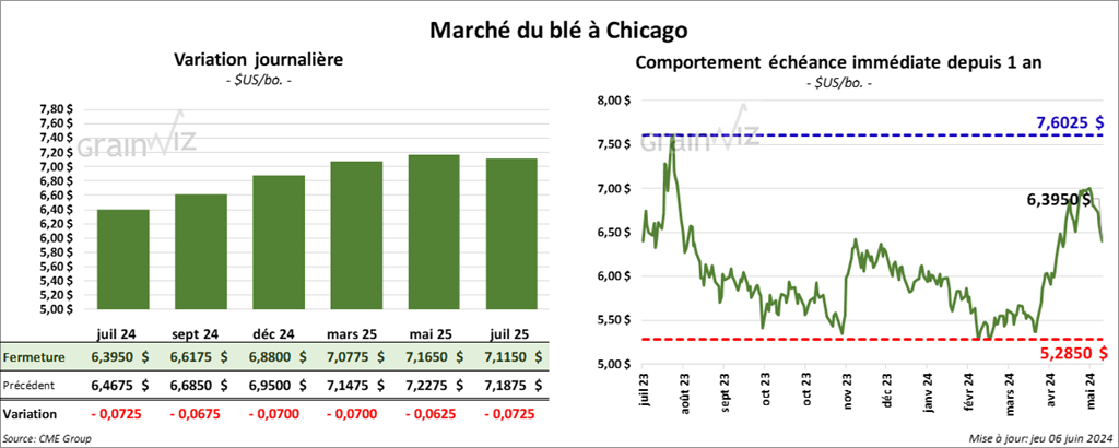 À Chicago, le contrat de blé US a clôturé à 6,3950 $ (- 7 ¼ cents). Celui sept. 24 a fermé à 6,6175 $ (- 6 ¾ cents). Celui déc. 24 a terminé à 6,8800 $ (- 7 cents). À Kansas, le contrat de blé dur rouge a fini à 6,7800 $ (+ 1 ¾ cent). Celui sept. 24 a clôturé à 6,9200 $ (+ 1 ½ cent). Celui déc. 24 a fermé à 7,1200 $ (+ 1 ½ cent). À Minneapolis, le contrat sept. 24 a terminé à 7,1625 $ (- 5 ¼ cents). Celui déc. 24 a fini à 7,3275 $ (- 5 cents). Celui mars 25 a clôturé à 7,4600 $ (- 4 ½ cents).