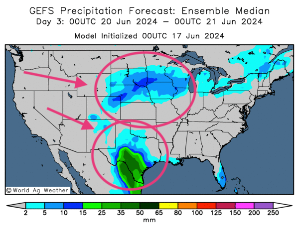 Cette carte US, fournie par World Ag Weather et dessinée pour les 3 prochains jours, montre notamment des possibilités de précipitations pour certaines zones de l’ouest du Midwest et du nord des Plaines US. Des portions importantes du Texas pourraient également être affectées par des averses abondantes (voir les zones vertes).
