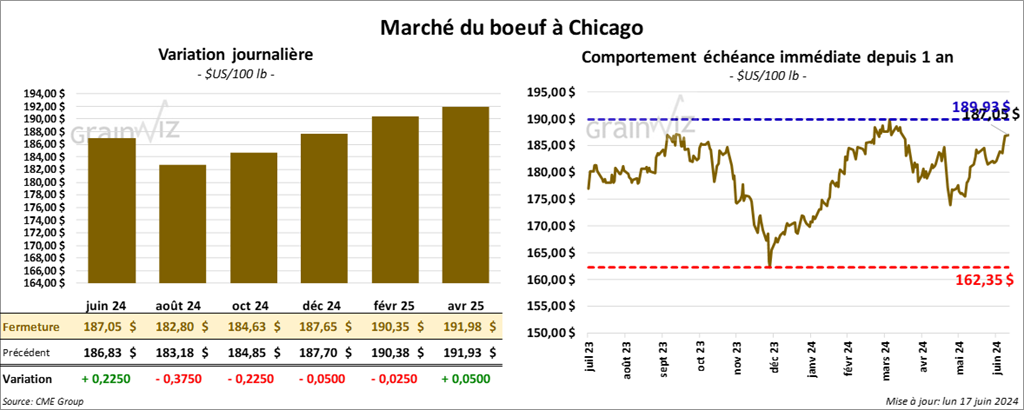 Le contrat de bœuf US juin 24 a clôturé à 187,05 $ (+ 23 cents). Celui août 24 a fermé à 182,80 $ (- 38 cents). Celui oct. 24 a terminé à 184,63 $ (- 23 cents). Quant au veau US, le contrat août 24 a fini à 261,32 $ (- 65 cents). Celui sept. 24 a clôturé à 262,57 $ (- 13 cents). Celui oct. 24 a fermé à 263,30 $ (+ 20 cents).