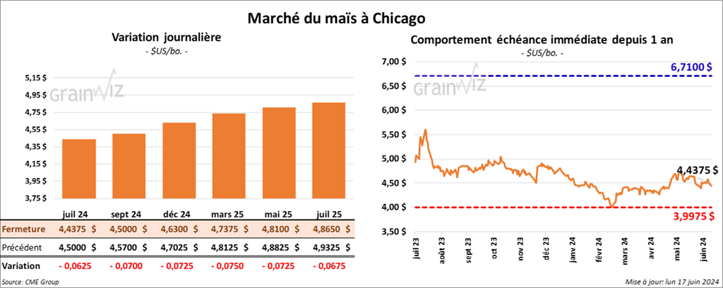 Le contrat de maïs US juil. 24 a clôturé à 4,4375 $ (- 6 ¼ cents). Celui sept. 24 a fermé à 4,5000 $ (- 7 cents). Celui déc. 24 a terminé à 4,6300 $ (- 7 ¼ cents).