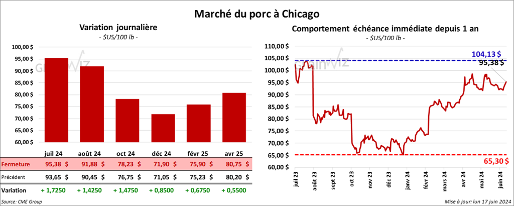 Le contrat de porc US juil. 24 a clôturé à 95,38 $ (+ 1,73 $). Celui août 24 a fermé à 91,88 $ (+ 1,43 $). Celui oct. 24 a terminé à 78,23 $ (+ 1,48 $).