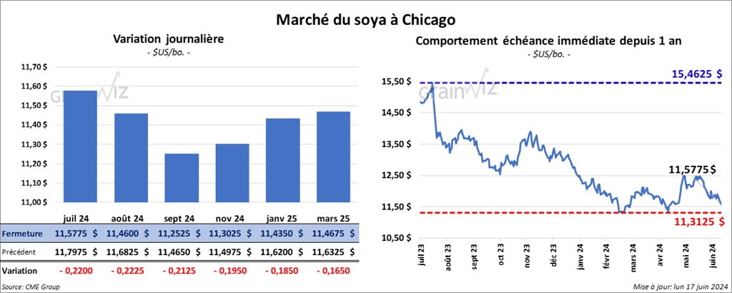 Le contrat de soya US juil. 24 a clôturé à 11,5775 $ (- 22 cents). Celui août 24 a fermé à 11,4600 $ (- 22 ¼ cents). Celui sept. 24 a terminé à 11,2525 $ (- 21 ¼ cents). Quant au tourteau de soya US, le contrat juil. 24 a fini à 360,30 $/tonne (- 8,10 $/tonne). Celui août 24 a clôturé à 348,20 $/tonne (- 7,90 $/tonne). Celui sept. 24 a fermé à 341,80 $/tonne (- 8,00 $/tonne). Du côté de l’huile de soya US, le contrat juil. 24 a terminé à 43,73 $ (+ 5 points). Celui août 24 a fini à 43,94 $ (+ 4 points).