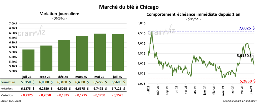À Chicago, le contrat de blé US juil. 24 a clôturé à 5,9150 $ (- 21 ¼ cents). Celui sept. 24 a fermé à 6,0800 $ (- 20 ½ cents). Celui déc. 24 a terminé à 6,3100 $ (- 19 ¼ cents). À Kansas, le contrat de blé dur rouge juil. 24 a fini à 6,0540 $ (- 22 cents). Celui sept. 24 a clôturé à 6,1540 $ (- 20 ¾ cents). Celui déc. 24 a fermé à 6,3420 $ (- 20 ½ cents). À Minneapolis, le contrat de blé de printemps sept. 24 a terminé à 6,4750 $ (- 18 ½ cents). Celui déc. 24 a fini à 6,6600 $ (- 19 cents). Celui mars 25 a clôturé à 6,8275 $ (- 19 cents).
