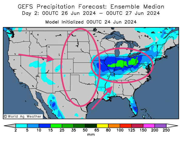 - Cette carte US, fournie par World Ag Weather et dessinée pour le 26 juin, montre notamment des possibilités de pluies abondantes dans le sud des Grands Lacs, entre l’Iowa et l’Ohio. Elle indique aussi un temps sec probable pour la totalité des Plaines US.
