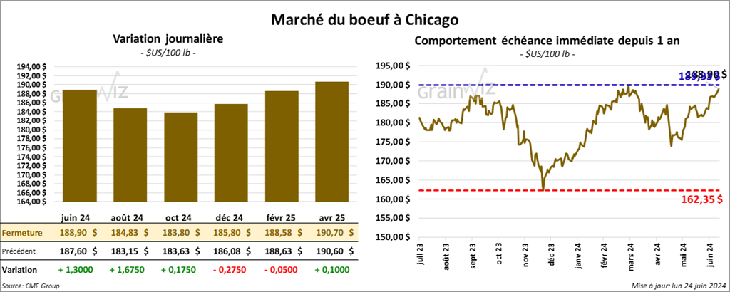 Le contrat de bœuf US juin 24 a clôturé à 188,90 $ (+ 1,30 $). Celui août 24 a fermé à 184,83 $ (+ 1,68 $). Celui oct. 24 a terminé à 183,80 $ (+ 18 cents). Quant au veau US, le contrat août 24 a fini à 258,90 $ (+ 53 cents). Celui sept. 24 a clôturé à 260,13 $ (+ 23 cents). Celui oct. 24 a fermé à 260,68 $ (+ 5 cents).