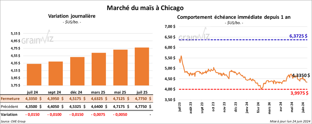 Le contrat de maïs US juil. 24 a clôturé à 4,3350 $ (- 1 ½ cent). Celui sept. 24 a fermé à 4,3950 $ (- 1 cent). Celui déc. 24 a terminé à 4,5175 $ (- 1 ½ cent).