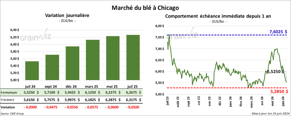 À Chicago, le contrat de blé juil. 24 a clôturé à 5,5250 $ (- 9 cents). Celui sept. 24 a fermé à 5,7100 $ (- 4 ¾ cents). Celui déc. 24 a terminé à 5,9425 $ (- 5 ½ cents). À Kansas, le contrat de blé dur rouge juil. 24 a fini à 5,8140 $ (+ ¼ cent). Celui sept. 24 a clôturé à 5,8740 $ (+ ½ cent). Celui déc. 24 a fermé à 6,0140 $ (- 1 ¾ cent). À Minneapolis, le contrat de blé de printemps sept. 24 a terminé à 6,1375 $ (- 3 ½ cents). Celui déc. 24 a fini à 6,3275 $ (- 4 cents). Celui mars 25 a clôturé à 6,5100 $ (- 3 ¾ cents).