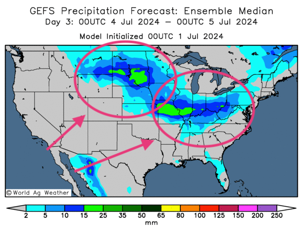 Cette carte US, fournie par World Ag Weather et dessinée pour les 3 prochains jours, montre des probabilités de pluies abondantes pour le nord des Plaines US et le centre du Midwest (voir les zones vertes).