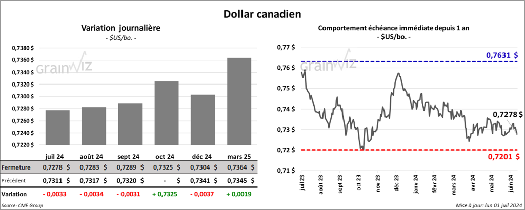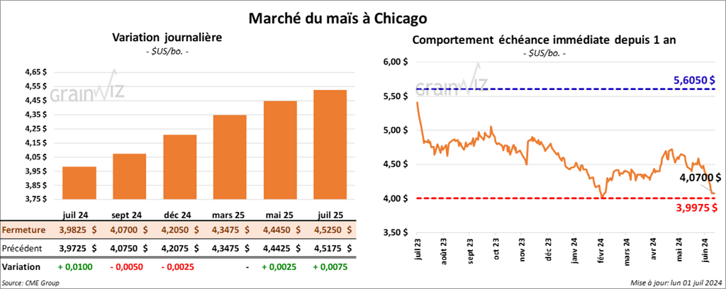 Le contrat de maïs US juil. 24 a clôturé à 3,9825 $ (+ 1 cent). Celui sept 24 a fermé à 4,0700 $ (+ ½ cent). Celui déc. 24 a terminé à 4,2050 $ (- ¼ cent).
