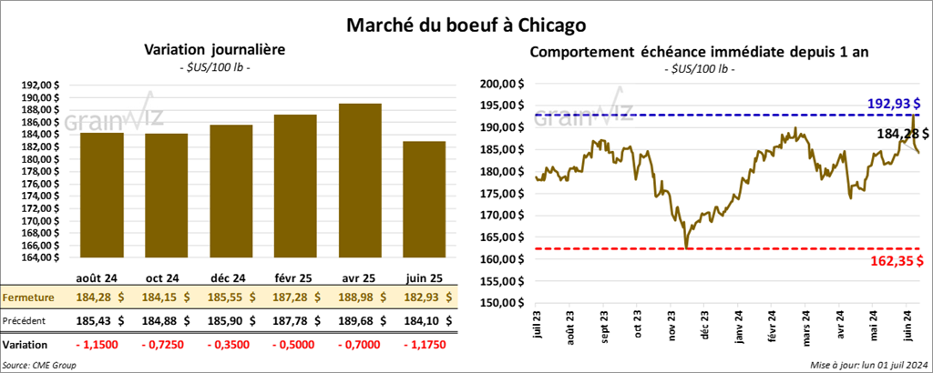 Le contrat de bœuf US août 24 a clôturé à 184,28 $ (- 15 cents). Celui oct. 24 a fermé à 184,15 $ (- 73 cents). Celui déc. 24 a terminé à 185,55 $ (- 35 cents). Quant au veau US, le contrat août 24 a fini à 357,38 $ (- 1,93 $). Celui sept. 24 a clôturé à 257,95 $ (- 1,70 $). Celui oct. 24 a fermé à 258,18 $ (- 1,82 $).
