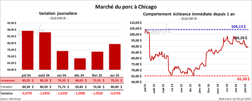 Le contrat de porc US juil. 24 a clôturé à 89,20 $ (- 38 cents). Celui août 24 a fermé à 88,18 $ (- 1,33 $). Celui oct. 24 a terminé à 74,10 $ (- 1,63 $).