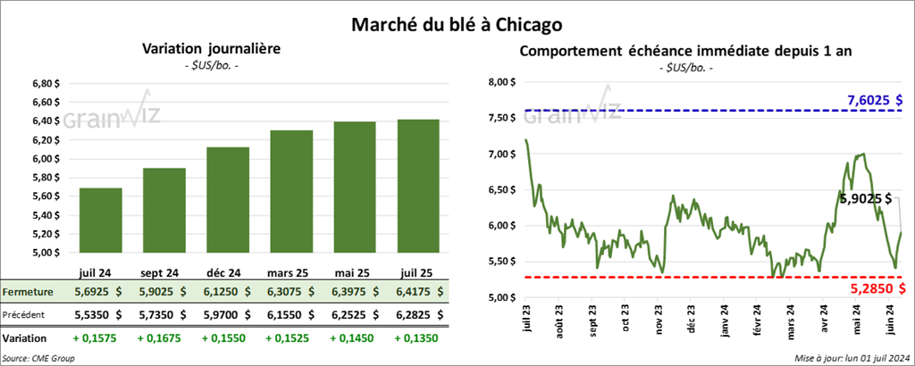 À Chicago, le contrat de blé juil. 24 a clôturé à 5,6925 $ (+ 15 ¾ cents). Celui sept. 24 a fermé à 5,9025 $ (+ 16 ¾ cents). Celui déc. 24 a terminé à 6,1250 $ (+ 15 ½ cents). À Kansas, le contrat de blé dur rouge juil. 24 a fini à 6,0260 $ (+ 15 ¼ cents). Celui sept. 24 a clôturé à 5,9940 $ (+ 13 ¼ cents). Celui déc. 24 a fermé à 6,1520 $ (+ 12 cents). À Minneapolis, le contrat de blé de printemps sept. 24 a terminé à 6,3225 $ (+ 19 ¼ cents). Celui déc. 24 a fini à 6,5075 $ (+ 18 ¼ cents). Celui mars 25 a clôturé à 6,6550 $ (+ 16 ¼ cents).
