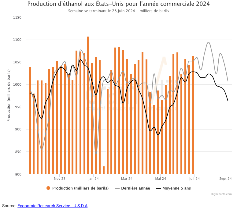 Durant la semaine du 28 juin dernier, la production moyenne d’éthanol US a été de 1,064 million de barils par jour, ce qui était une hausse de 2,0 % comparativement à la semaine précédente et une augmentation de 0,4 % par rapport à l’an dernier. Un total de 7,448 millions de barils a été produit au cours de la semaine. 105,61 millions de boisseaux de maïs US ont été utilisés dans la fabrication de l’éthanol US.