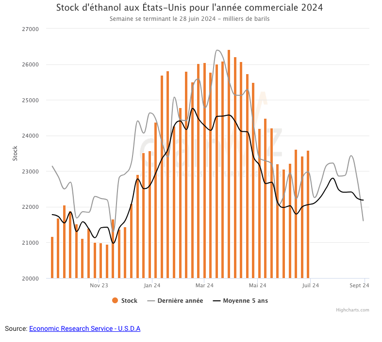 Quant aux inventaires d’éthanol US, ils ont été établis à 23,594 millions de barils, soit à un nouveau sommet de l’année, à une hausse de 0,7 % par rapport à la semaine précédente et à une augmentation de 6,0 % comparativement à l’an passé.