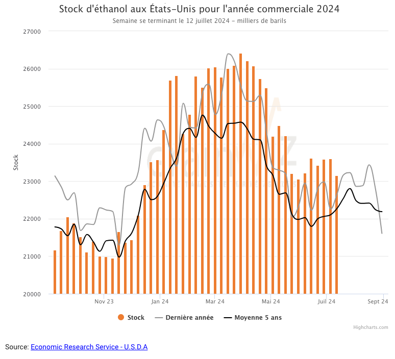 Durant la semaine du 12 juillet dernier, la production moyenne d’éthanol US a été de 1,106 million de barils par jour, ce qui était un sommet de l’année, une augmentation de 4,9 % comparativement à la semaine précédente et une hausse de 3,4 % par rapport à l’an dernier. Un total de 7,742 millions de barils a été produit au cours de la semaine. 109,78 millions de boisseaux de maïs ont été utilisés dans la fabrication de l’éthanol US.