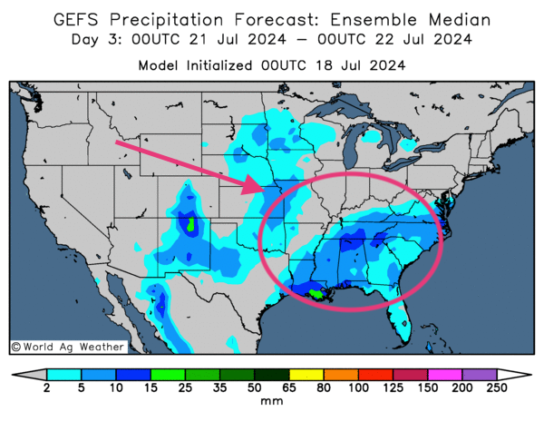 - Cette carte US, fournie par World Ag Weather et dessinée pour le 3ème jour, indique des possibilités de pluie pour l’ouest du Midwest et certaines parties des Plaines US. Des averses plus abondantes pourraient même avoir lieu dans le sud-est US, entre la Louisiane et le Mississippi. À noter que le temps pourrait être ensoleillé dans le sud des Grands Lacs, entre l’Illinois, l’Indiana, l’Ohio et le sud du Michigan.