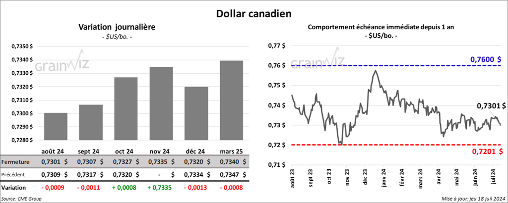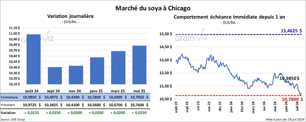 Le contrat de soya US août 24 a clôturé à 10,9850 $ (+ 1 ¼ cent). Celui sept. 24 a fermé à 10,4075 $ (+ 2 ½ cents). Celui nov. 24 a terminé à 10,4300 $ (+ 2 cents). Quant au tourteau de soya US, le contrat août 24 a fini à 337,20 $/tonne (- 1,90 $/tonne). Celui sept. 24 a clôturé à 318,10 $/tonne (- 1,30 $/tonne). Celui oct. 24 a fermé à 309,30 $/tonne (- 1,30 $/tonne). Du côté de l’huile de soya US, le contrat août 24 a terminé à 46,45 $ (+ 24 points). Celui sept. 24 a fini à 45,70 $ (+ 28 points).