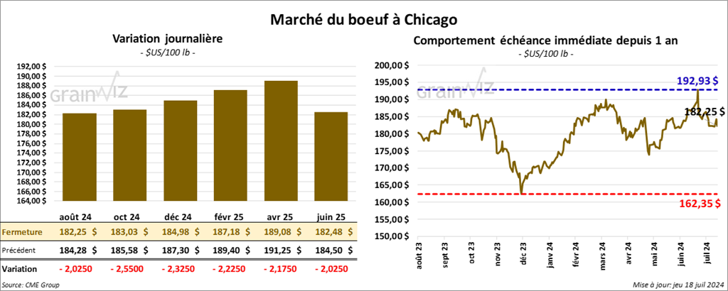 Le contrat août 24 a clôturé à 182,25 $ (- 2,03 $). Celui oct. 24 a fermé à 183,03 $ (- 2,55 $). Celui déc. 24 a terminé à 184,98 $ (- 2,33 $). Quant au veau US, le contrat août 24 a fini à 256,23 $ (- 2,33 $). Celui sept. 24 a clôturé à 257,00 $ (- 2,55 $). Celui oct. 24 a fermé à 256,95 $ (- 2,45 $).