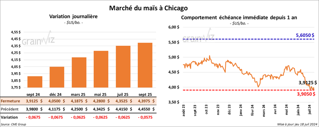 Le contrat de maïs US sept. 24 a clôturé à 3,9125 $ (- 6 ¾ cents). Celui déc. 24 a fermé à 4,0500 $ (- 6 ¾ cents). Celui mars 25 a terminé à 4,1875 $ (- 6 ¼ cents).