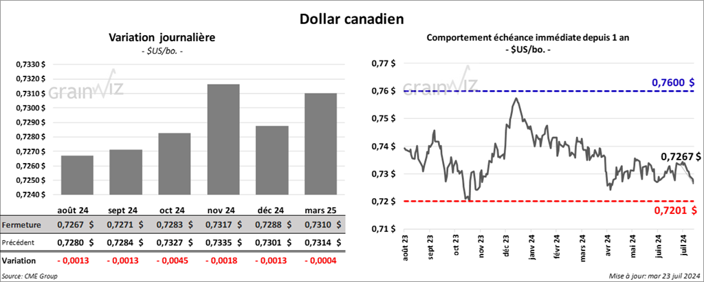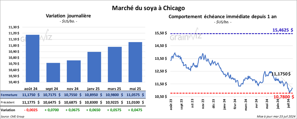 Le contrat de soya US sept. 24 a clôturé à 11,1750 $ (- ¼ cent). Celui sept. 24 a fermé à 10,7175 $ (+ 7 cents). Celui nov. 24 a terminé à 10,7550 $ (+ 6 ¾ cents). Quant au tourteau de soya US, le contrat août 24 a fini à 342,70 $/tonne (- 90 cents/tonne). Celui sept. 24 a clôturé à 325,40 $/tonne (+ 40 cents/tonne). Celui oct. 24 a fermé à 317,10 $/tonne (- 30 cents/tonne). Du côté de l’huile de soya US, le contrat août 24 a terminé à 46,66 $ (- 34 points). Celui sept. 24 a fini à 46,08 $ (- 14 points).