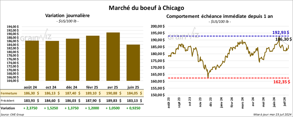 Le contrat de bœuf US août 24 a clôturé à 186,30 $ (+ 2,38 $). Celui oct. 24 a fermé à 186,13 $ (+ 1,53 $). Celui déc. 24 a terminé à 187,40 $ (+ 1,38 $). Quant au veau US, le contrat août 24 a fini à 258,75 $ (+ 2,35 $). Celui sept. 24 a clôturé à 258,60 $ (+ 2,10 $). Celui oct. 24 a fermé à 258,43 $ (+ 2,17 $).