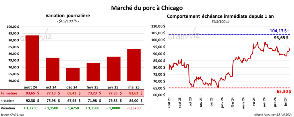 Le contrat de porc US août 24 a clôturé à 93,65 $ (+ 1,28 $). Celui oct. 24 a fermé à 77,13 $ (+ 1,15 $). Celui déc. 24 a terminé à 69,43 $ (+ 1,48 $).