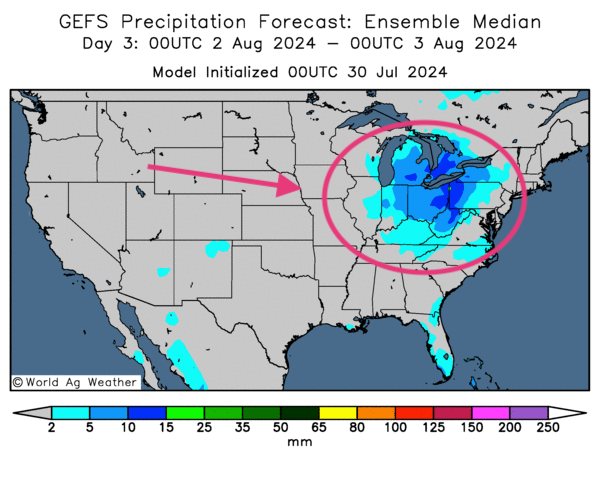 Cette carte US, fournie par World Ag Weather et dessinée pour le 3ème jour, montre notamment des probabilités de précipitations pour l’est du Midwest, autour des Grands Lacs.