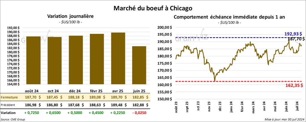 Le contrat de bœuf US août 24 a clôturé à 187,70 $ (+ 72 ½ cents). Celui oct. 24 a fermé à 187,45 $ (+ 65 cents). Celui déc. 24 a terminé à 188,18 $ (+ 50 cents). Quant au veau US, le contrat août 24 a fini à 256,98 $ (+ 55 points). Celui sept. 24 a clôturé à 256,95 $ (+ 88 cents). Celui oct. 24 a fermé à 255,88 $ (+ 68 cents).