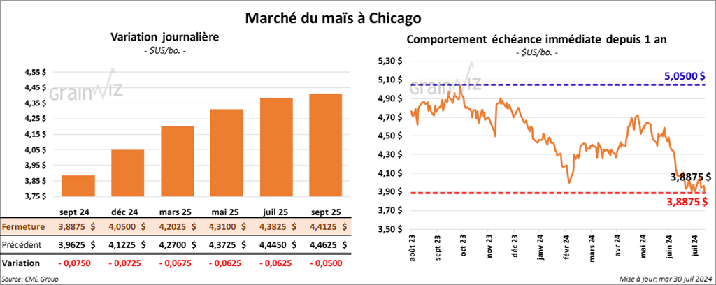 Le contrat de maïs US sept. 24 a clôturé à 3,8875 $ (- 7 ½ cents). Celui déc. 24 a fermé à 4,0550 $ (- 7 ¼ cents). Celui mars 25 a terminé à 4,2025 $ (- 6 ¾ cents).