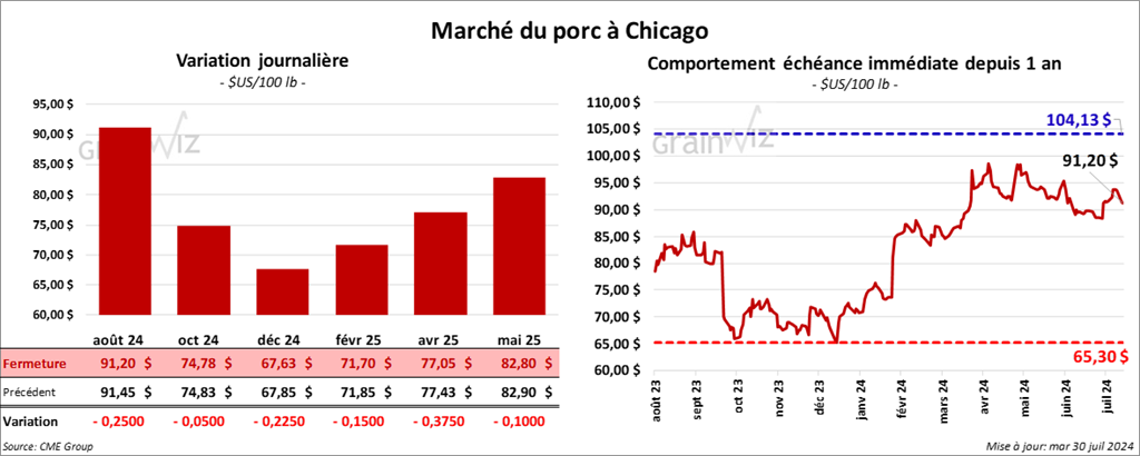 Le contrat août 24 a clôturé à 91,20 $ (- 25 cents). Celui oct. 24 a fermé à 74,78 $ (- 5 cents). Celui déc. 24 a terminé à 67,63 $ (- 23 cents).