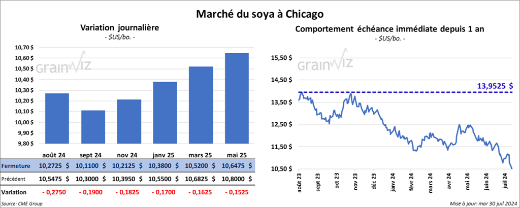 Le contrat de soya US août 24 a clôturé à 10,2725 $ (- 27 ½ cents). Celui sept. 24 a fermé à 10,1100 $ (- 19 cents). Celui nov. 24 a terminé à 10,2125 $ (- 18 ¼ cents). Quant au tourteau de soya US, le contrat août 24 a fini à 352,20 $/tonne (- 3,50 $/tonne). Celui sept. 24 a clôturé à 329,40 $/tonne (- 5,60 $/tonne). Celui oct. 24 a fermé à 316,90 $/tonne (- 6,30 $/tonne). Du côté de l’huile de soya US, le contrat août 24 a terminé à 42,75 $ (- 9 points). Celui sept. 24 a fini à 42,71 $ (+ 13 points).