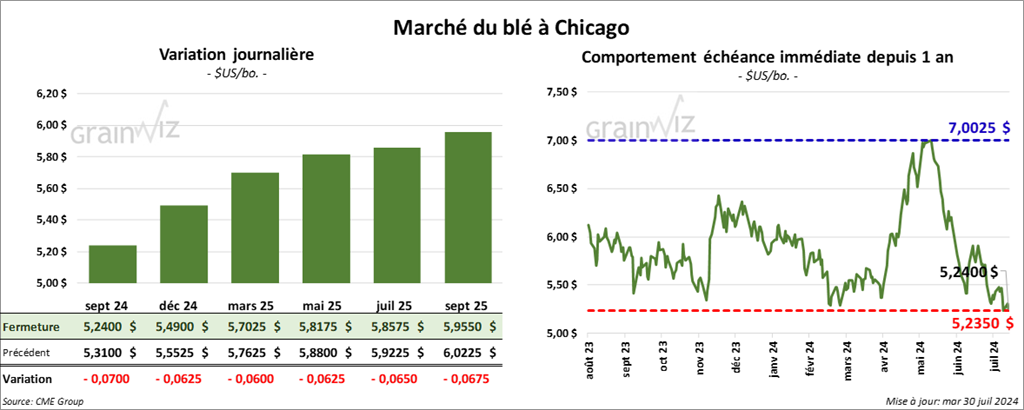 À Chicago, le contrat sept. 24 a clôturé à 5,2400 $ (- 7 cents). Celui déc. 24 a fermé à 5,4900 $ (- 6 ¼ cents). Celui mars 25 a terminé à 5,7025 $ (- 6 cents). À Kansas, le contrat sept. 24 a fini à 5,5020 $ (- 3 ¼ cents). Celui déc. 24 a clôturé à 5,6620 $ (- 3 cents). Celui mars 25 a fermé à 5,8020 $ (- 2 ½ cents). À Minneapolis, le contrat de blé de printemps sept. 24 a terminé à 5,8450 $ (- 7 cents). Celui déc. 24 a fini à 6,0325 $ (- 6 ¼ cents). Celui mars 25 a clôturé à 6,2125 $ (- 5 cents).