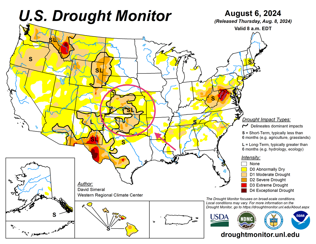 - L’US Drought Monitor montre que mardi dernier, le 6 août, 52 % des régions US se trouvaient dans des conditions anormalement sèches, ce qui était une augmentation de 3 points par rapport à la semaine précédente. L’USDA signifie par ailleurs qu’il y a 5 % des plants de maïs et de soya US qui sont présentement touchés par la sécheresse. Il avance également que 18 % des cultures de blé de printemps US se trouvent dans les mêmes conditions. La majorité du temps anormalement sec affectant les régions se trouve dans les Plaines US et plus à l’ouest.