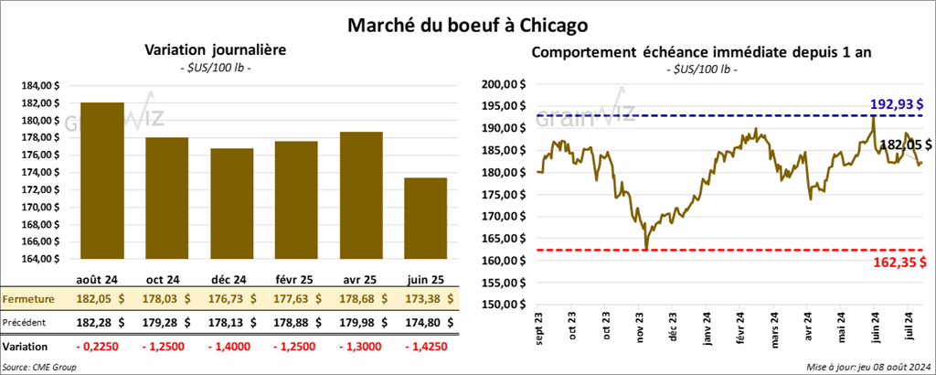 Le contrat de bœuf US août 24 a clôturé à 182,05 $ (- 23 cents). Celui oct. 24 a fermé à 178,03 $ (- 1,25 $). Celui déc. 24 a terminé à 176,73 $ (- 1,40 $). Quant au veau US, le contrat août 24 a fini à 242,38 $ (- 25 cents). Celui sept. 24 a clôturé à 237,43 $ (- 1,48 $). Celui oct. 24 a fermé à 236,00 $ (- 2,13 $).
