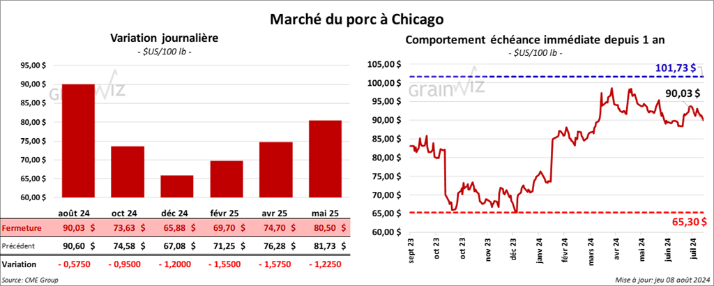 Le contrat de porc US août 24 a clôturé à 90,03 $ (- 58 cents). Celui oct. 24 a fermé à 73,63 $ (- 95 cents). Celui déc. 24 a terminé à 65,88 $ (- 1,20 $).