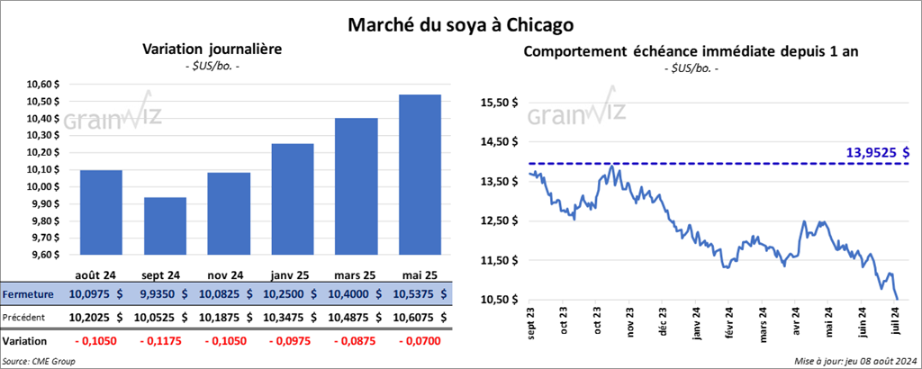 Le contrat de soya US août 24 a clôturé à 10,0975 ù$ (- 10 ½ cents). Celui sept. 24 a fermé à 9,9350 $ (- 11 ¾ cents). Celui nov. 24 a terminé à 10,0825 $ (- 10 ½ cents). Quant au tourteau de soya US, le contrat août 24 a fini à 335,30 $/tonne (- 7,00 $/tonne). Celui sept. 24 a clôturé à 319,50 $/tonne (- 4,10 $/tonne). Celui oct. 24 a fermé à 313,40 $/tonne (- 2,40 $/tonne). Du côté de l’huile de soya US, le contrat août 24 a terminé à 42,36 $ (+ 11 points). Celui sept. 24 a fini à 42,17 $ (+ 10 points).