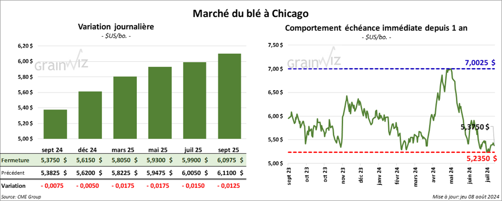 À Chicago, le contrat de blé sept. 24 a clôturé à 5,3750 $ (- ¾ cent). Celui déc. 24 a fermé à 5,6150 $ (- ½ cent). Celui mars 25 a terminé à 5,8050 $ (- 1 ¾ cent). À Kansas, le contrat de blé dur rouge sept. 24 a fini à 5,5140 $ (- 4 cents). Celui déc. 24 a clôturé à 5,6860 $ (- 3 ½ cents). Celui mars 25 a fermé à 5,8220 $ (- 4 ¾ cents). À Minneapolis, le contrat de blé de printemps sept. 24 a terminé à 5,8525 $ (- ½ cent). Celui déc. 24 a fini à 6,0525 $ (- 1 ½ cent). Celui mars 25 a clôturé à 6,2250 $ (- 2 cents).