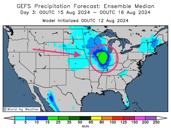 Cette carte US fournie par World Ag Weather et dessinée pour le 3ème jour, montre des possibilités de pluies légères pour le nord et le centre des Plaines US. Plus au centre du Midwest, là où se trouve l’Illinois, des averses plus abondantes pourraient survenir (voir les zones bleu foncé et vertes).