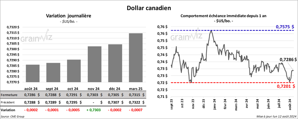 Le contrat de maïs US sept. 24 a clôturé à 3,8325 $ (+ 6 ½ cents). Celui déc. 24 a fermé à 4,0150 $ (+ 6 ½ cents). Celui mars 25 a terminé à 4,1900 $ (+ 6 ½ cents).