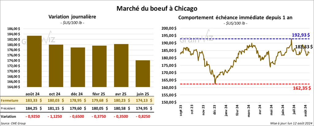 Le contrat de bœuf US août 24 a clôturé à 183,33 $ (- 33 cents). Celui oct. 24 a fermé à 180,03 $ (- 1,13 $). Celui déc. 24 a terminé à 178,95 $ (- 65 cents). Quant au veau US, le contrat août 24 a fini à 244,40 $ (- 2,10 $). Celui sept. 24 a clôturé à 239,50 $ (- 2,10 $). Celui oct. 24 a fermé à 237,73 $ (- 2,05 $).