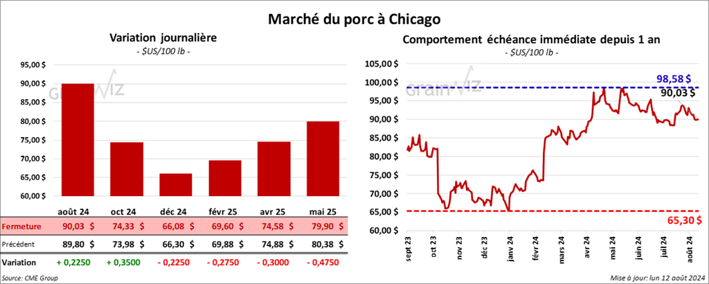 Le contrat de porc US août 24 a clôturé à 90,03 $ (+ 23 cents). Celui oct. 24 a fermé à 74,33 $ (+ 35 cents). Celui déc. 24 a terminé à 66,08 $ (- 23 cents).