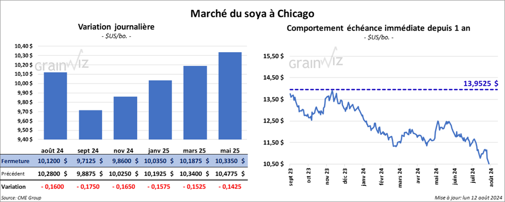 Le contrat de soya US août 24 a clôturé à 10,1200 $ (- 16 cents). Celui sept. 24 a fermé à 9,7125 $ (- 17 ½ cents). Celui nov. 24 a terminé à 9,8600 $ (- 16 ½ cents). Quant au tourteau de soya US, le contrat août 24 a fini à 318,30 $/tonne (- 8,00 $/tonne). Celui sept. 24 a clôturé à 306,00 $/tonne (- 5,70 $/tonne). Celui oct. 24 a fermé à 302,00 $/tonne (-5,70 $/tonne). Du côté de l’huile de soya US, le contrat août 24 a terminé à 41,61 $ (- 113 points). Celui sept. 24 a fini à 41,48 $ (- 94 points).