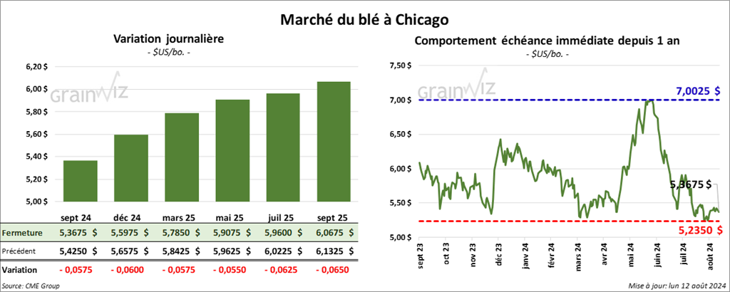 À Chicago, le contrat de blé sept. 24 a clôturé à 5,3675 $ (- 5 ¾ cents). Celui déc. 24 a fermé à 5,5975 $ (- 6 cents). Celui mars 25 a terminé à 5,7650 $ (- 5 ¾ cents). À Kansas, le contrat de blé dur rouge a fini à 5,4820 $ (- 5 ¾ cents). Celui déc. 24 a clôturé à 5,6340 $ (- 7,00 $). Celui mars 25 a fermé à 5,7640 $ (- 6 ½ cents). À Minneapolis, le contrat de blé de printemps US sept 24 a terminé à 5,9225 $ (+ 2 ½ cents). Celui déc. 24 a fini à 6,1200 $ (+ 3 ½ cents). Celui mars 25 a clôturé à 6,2825 $ (+ 3 cents).