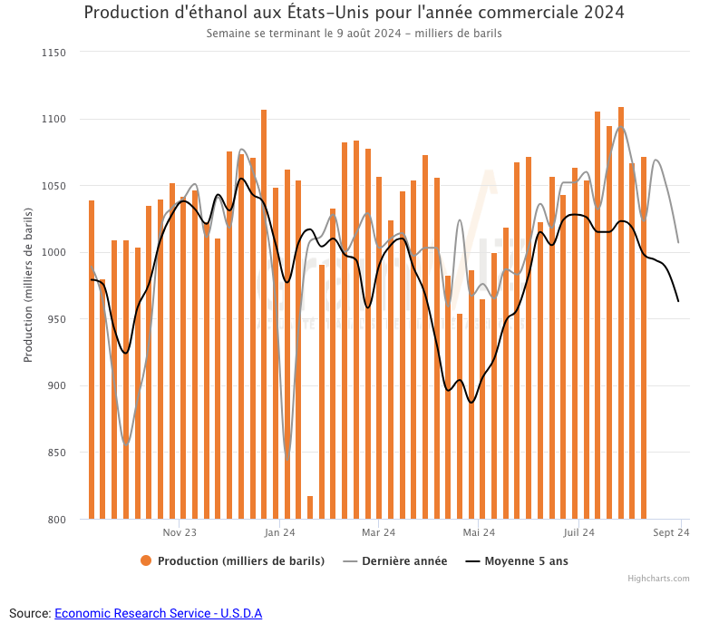 Au cours de la semaine du 9 août dernier, la production moyenne d’éthanol US a été de 1,072 million de barils par jour, ce qui était une augmentation de 0,5 % comparativement à la semaine précédente et une hausse de 0,3 % par rapport à l’an dernier. La moyenne des 5 dernières années était de 1,000 barils par jour. Au total, pour la semaine, 7,504 millions de barils d’éthanol US ont été produits. 106,40 millions de boisseaux de maïs ont été utilisés dans la fabrication de l’éthanol US.