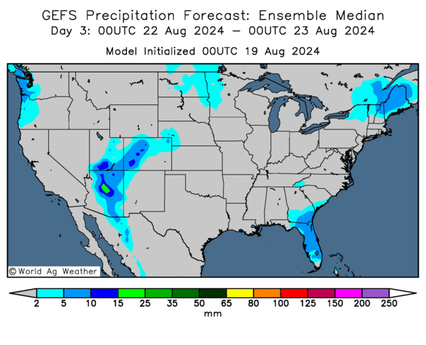 - Cette carte US, fournie par World Ag Weather et dessinée pour le 3ème jour, ne montre pas vraiment de possibilités de précipitation, sauf peut-être pour certains secteurs du nord des Plaines, entre le Dakota du Nord et le Minnesota. Mais il reste que celles-ci pourraient bien être légères.